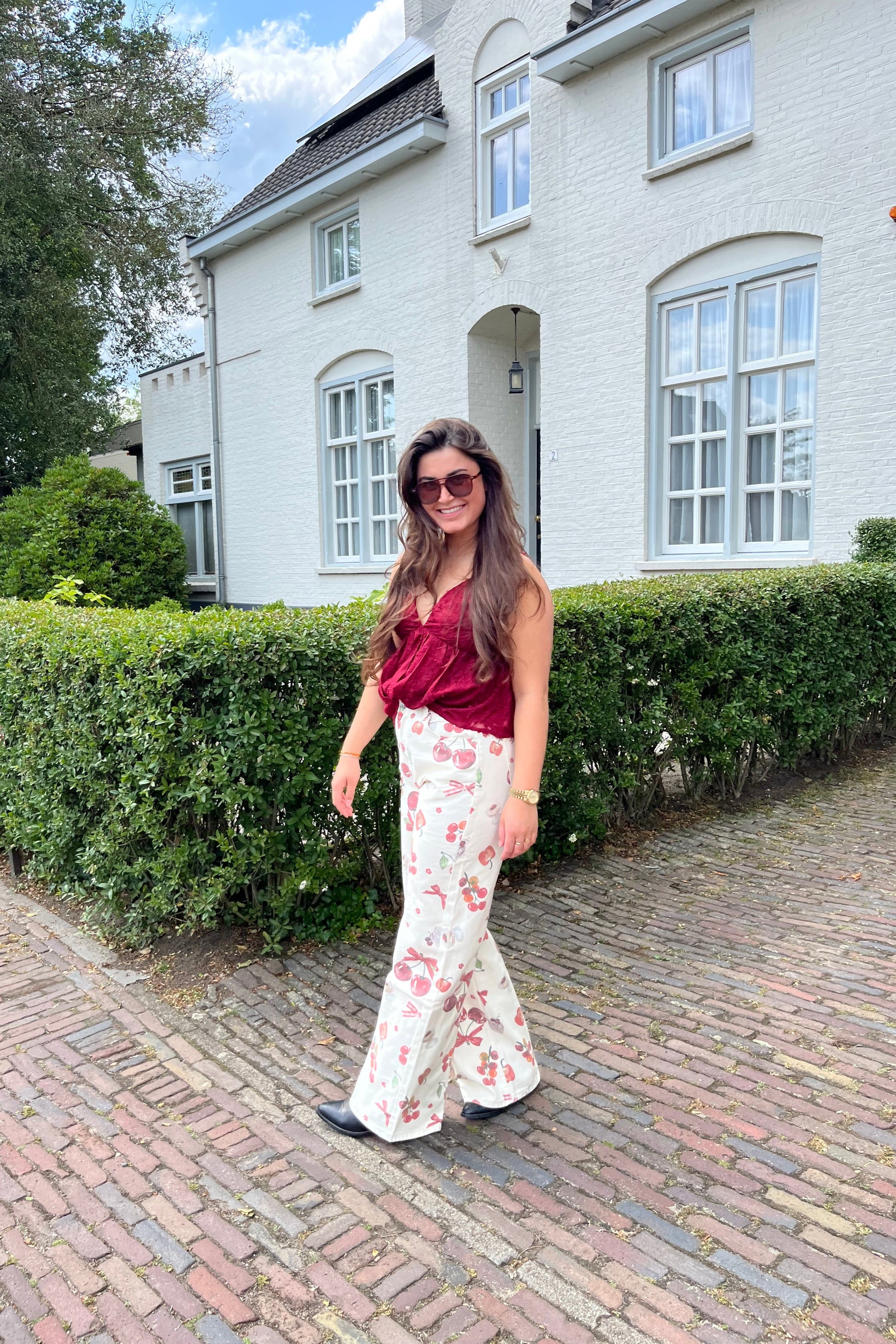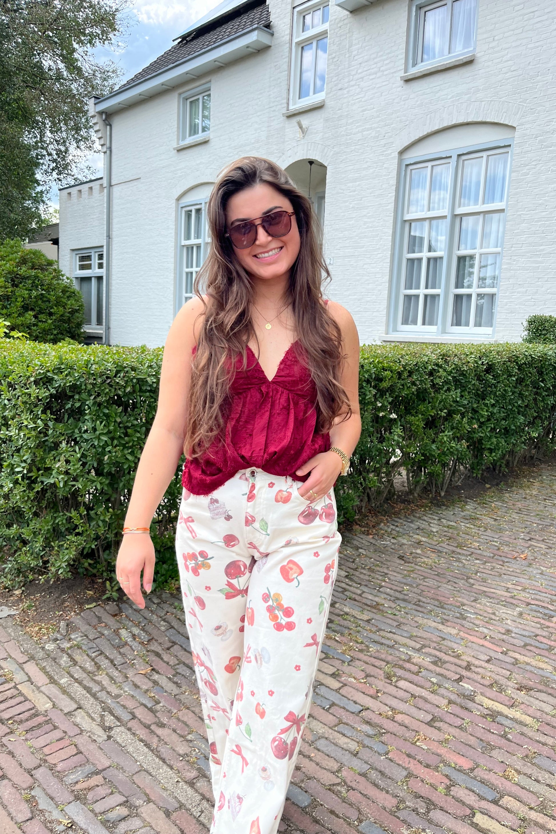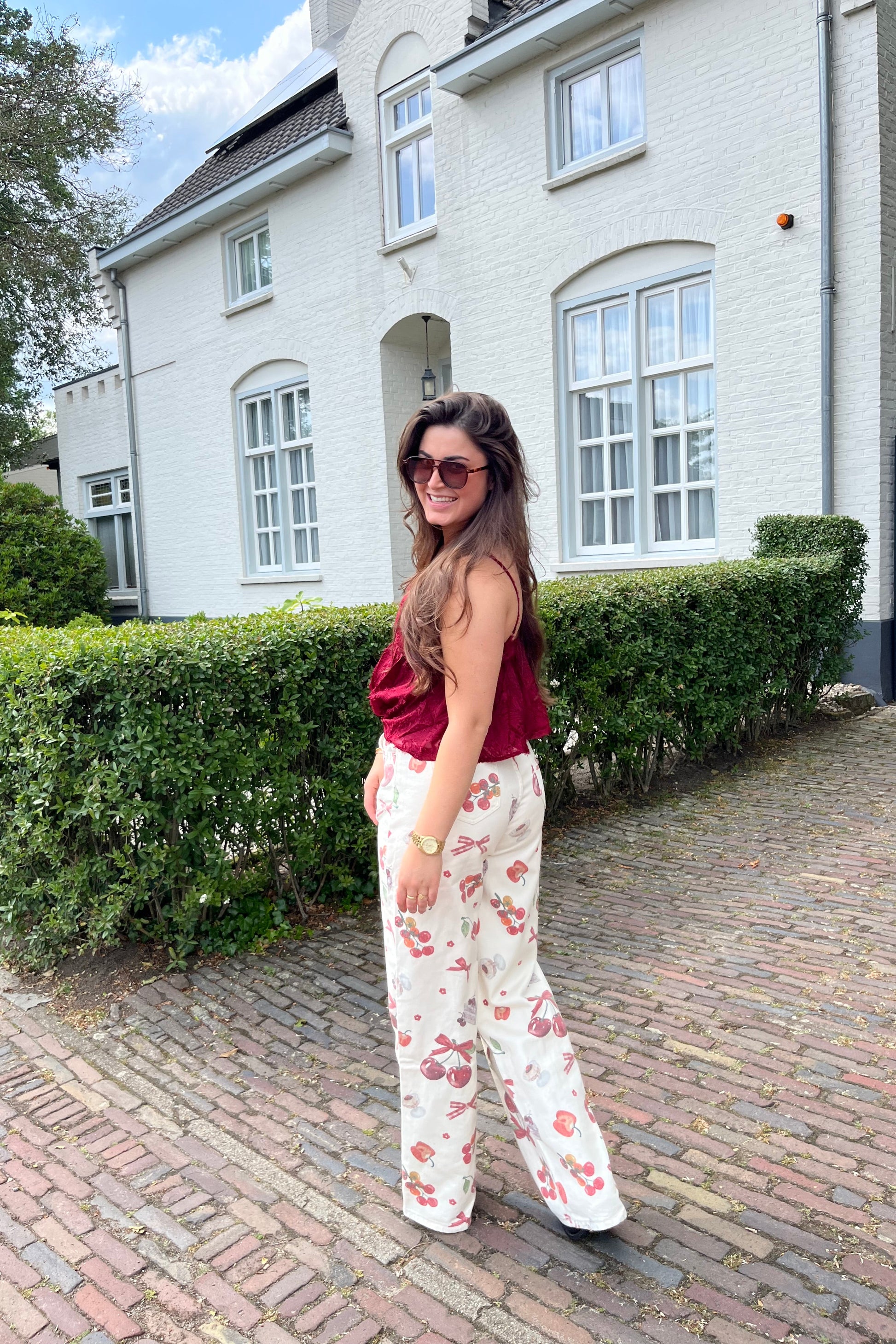 Hoe leuk is onze Fien-top met verstelbare spaghetti-bandjes! De top is volledig gevoerd en valt aan de voorzijde iets langer dan aan de achterzijde. Let op: op de foto is de top een beetje in de broek gestopt voor een speelse look.