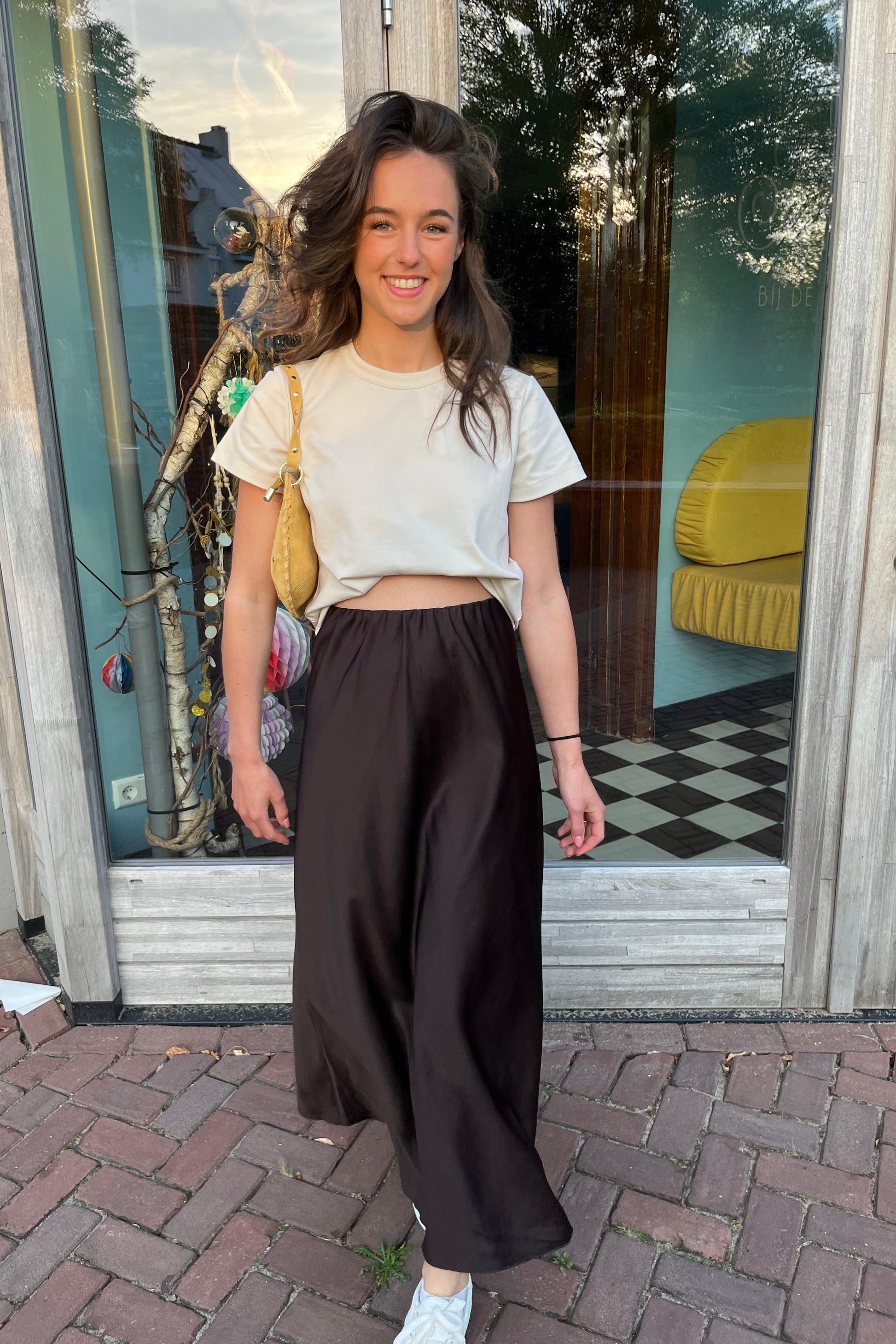 Deze satijnen rok is op zo veel leuke manieren te combineren! De rok heeft een elastische tailleband. ONE SIZE, kan gedragen worden vanaf maat XS t/m L.