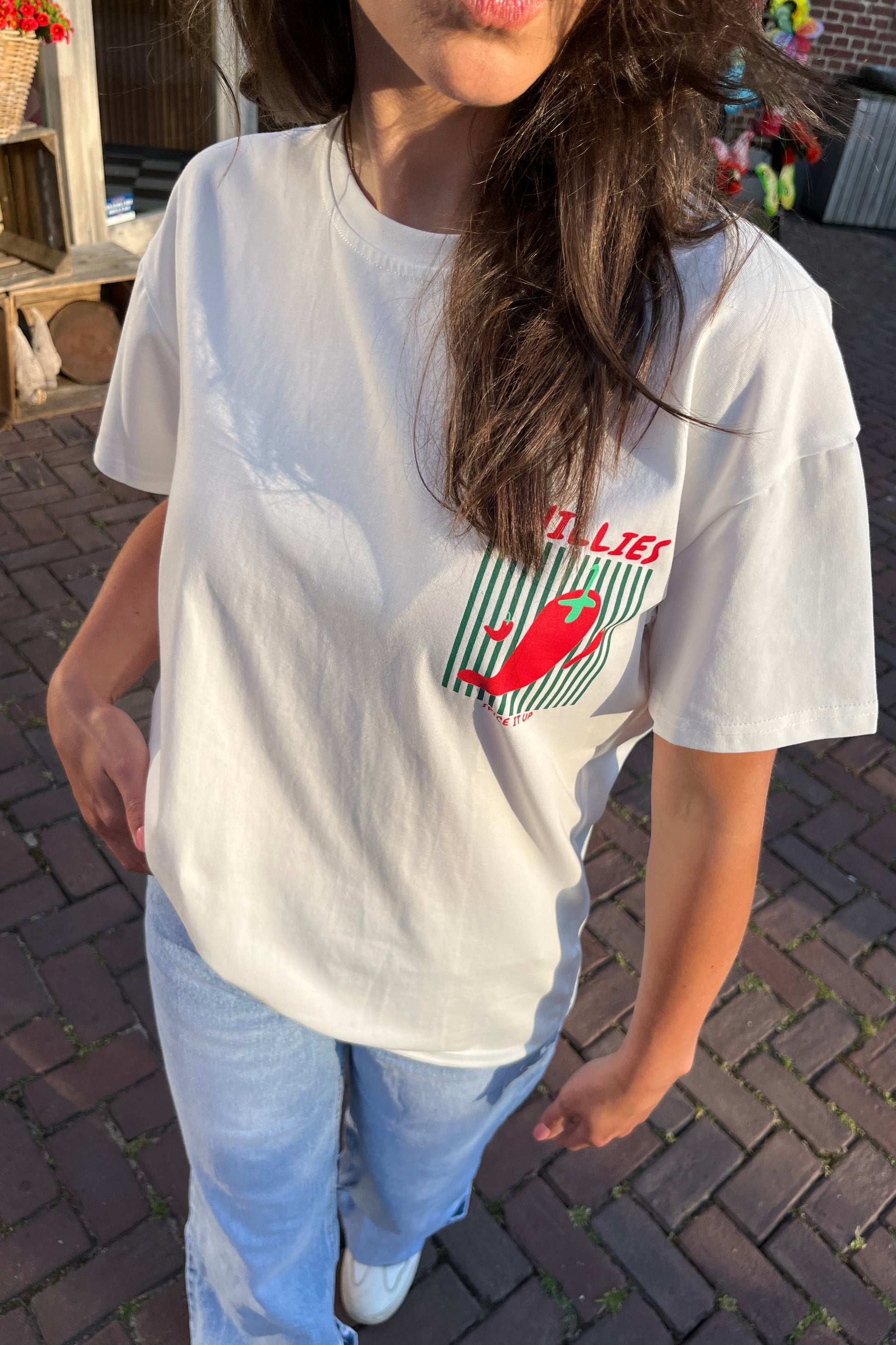 Hoe leuk is dit witte T-shirt met opdruk. Het shirtje is oversized en is ONE SIZE.