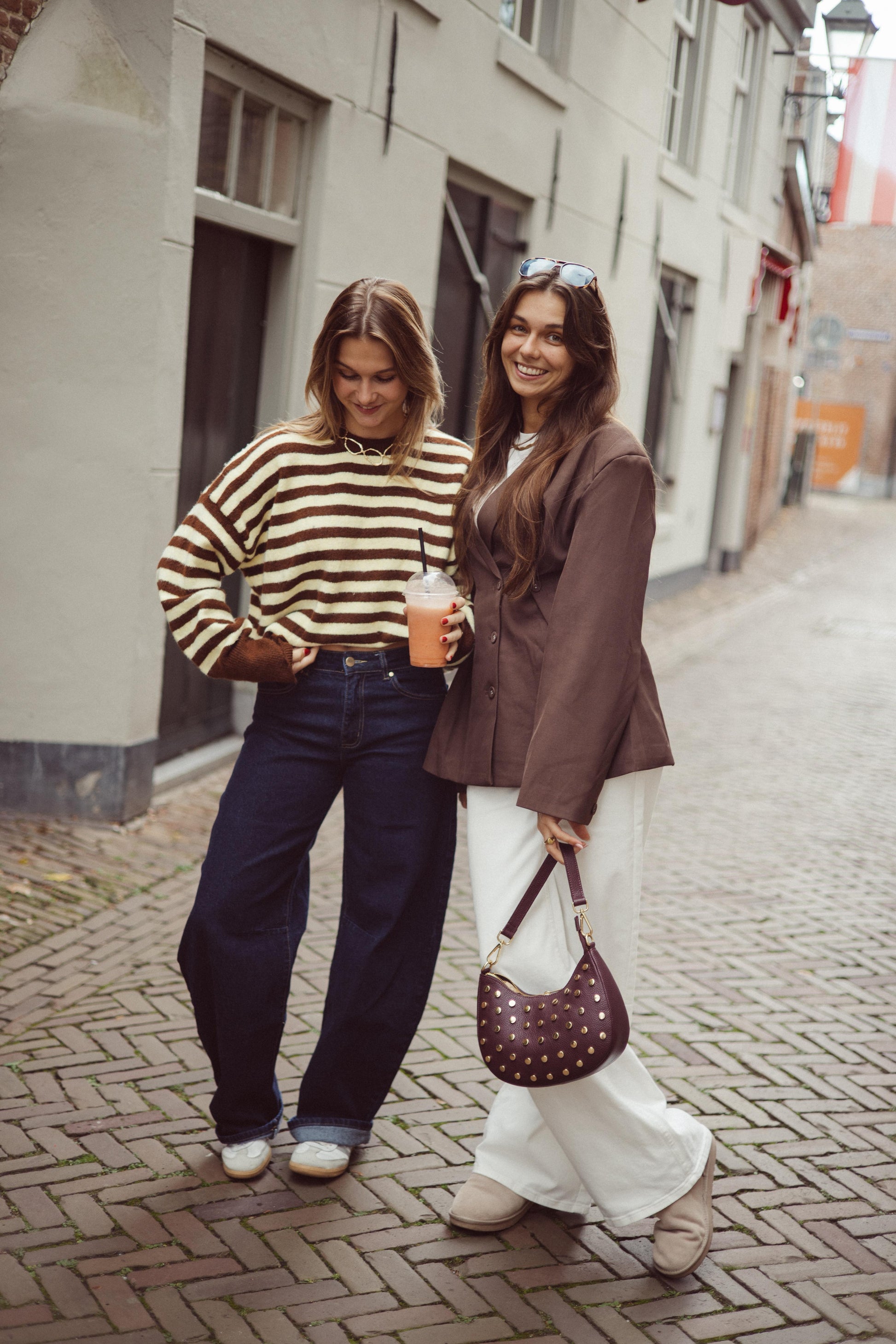 Een speelse knit met brede strepen in warm bruin en butter yellow. De losse fit maakt ‘m comfy en ideaal voor jouw everyday look.
